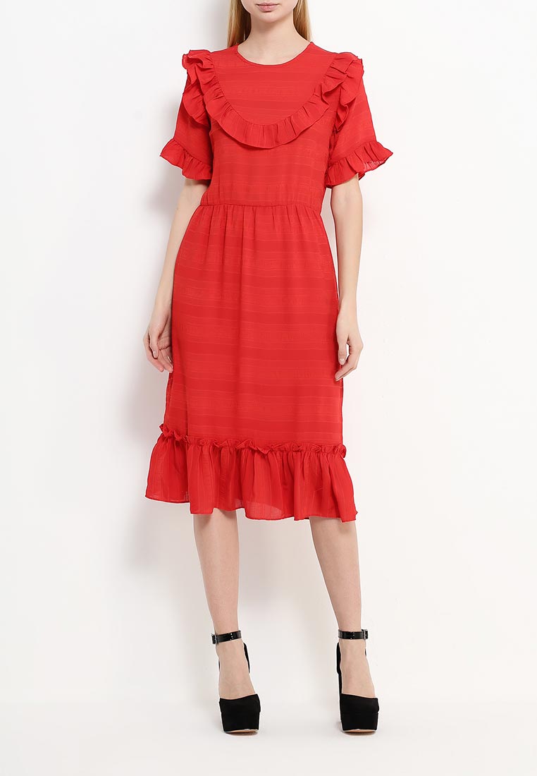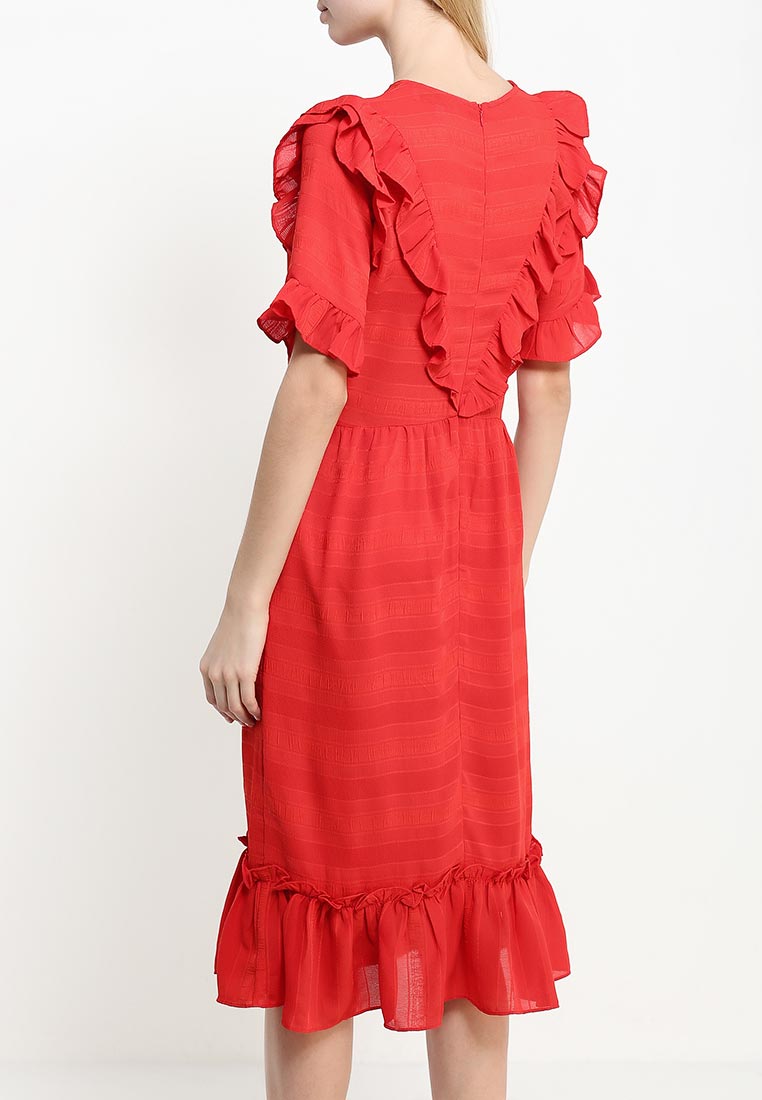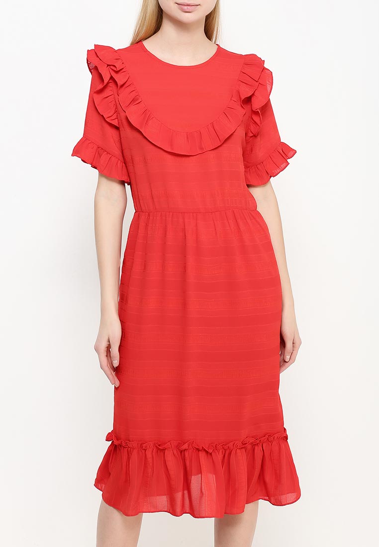 Платье приталенного кроя. Модель выполнена из легкого текстиля. Детали: круглый вырез, застежка на молнию, короткие рукава, рюши, текстильная подкладка.